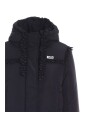 Stay warm and stylish this winter with the VIVETTA Rouches Detailed Padded Jacket in black. This hooded jacket features ruffles detailing, a rubber logo applique on the chest, and gathered drawstring. With side pockets, side vents, and a longer back, this jacket is both practical and fashionable. Made in Italy from 100% polyester with a polyester lining and padding, this jacket is sure to keep you cozy. Size 40, length 64 cm.