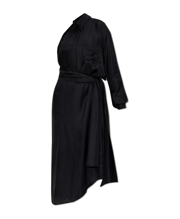 Introducing the DRESS WITH POCKET from the renowned brand Moschino,which exudes elegance and modernity. This BLACK dress with anasymmetrical cut impresses with its uniqueness. One side is adornedwith a long sleeve, while the other remains uncovered, adding a boldcharacter to it.Made from the highest quality viscose, the dress is extremely LIGHTAND SUBTLY SHIMMERING, giving it a luxurious expression. Ankle-lengthand subtle ties at the bottom make it the perfect choice for specialoccasions. A classic collar and a waist belt accentuate the silhouetteand add chic.WHY SHOULD YOU BUY THIS PRODUCT? * Unique asymmetrical cut and modern design. * High-quality viscose material ensuring comfort. * Elegant details such as ties and a classic collar. * Moschino brand known for luxury and creativity. Model`s MeasurementsHeight: 176cmBust: 85cmWaist: 60cmHips: 89cmModel is wearing size: 40