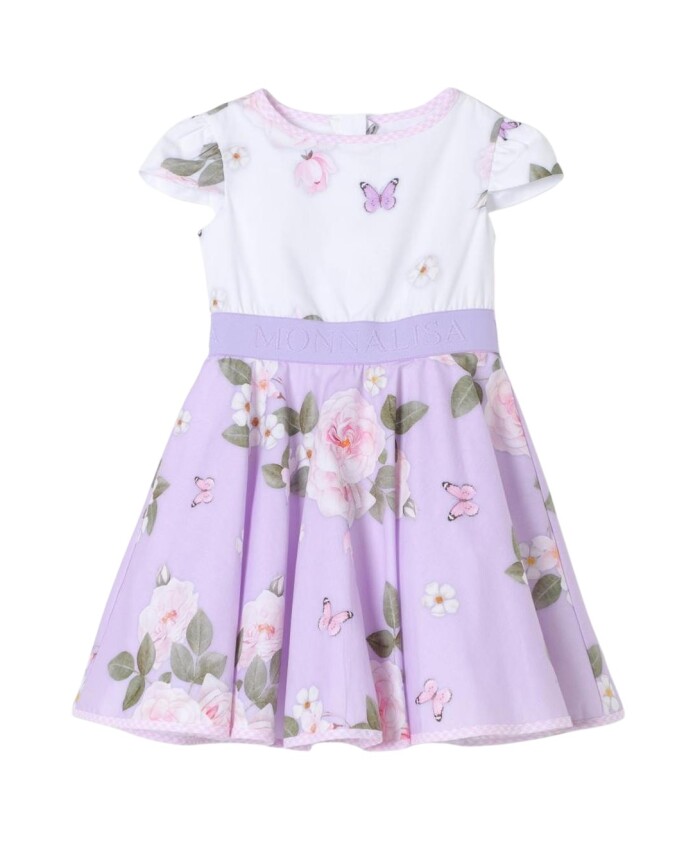 Elevate your little girl's wardrobe with this charming Monnalisa dress in white. Designed with attention to detail and style, this dress ensures comfort and elegance for any occasion. Made from a cotton blend, it features a white top section and a lavender bottom section with a floral and butterfly print.